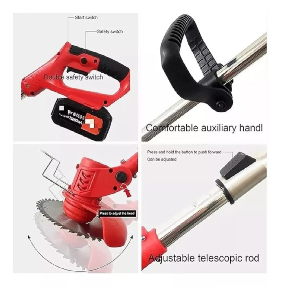 Accesorios Incluidos: 5 hojas plásticas, 2 hojas metálicas de disco, 2 hojas metálicas para podar, 2 baterías de litio recargables de 24V, gafas de protección, manual de uso y cargador de pared